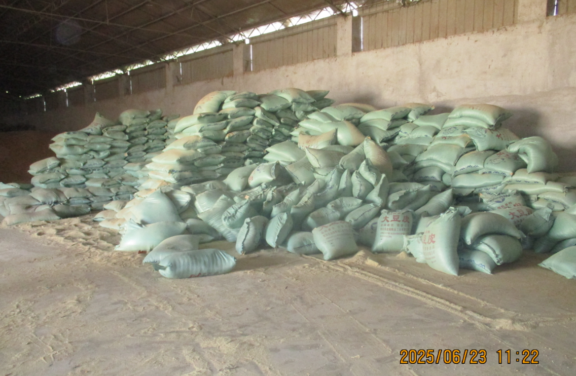 秦某强租赁彩钢棚后用于存放农副产品,后期共存放50吨豆皮,每袋豆皮40公斤。豆皮存放在南侧正对门口处,分多层码垛,垛高约3米,占地面积约90平方米。(见图2)