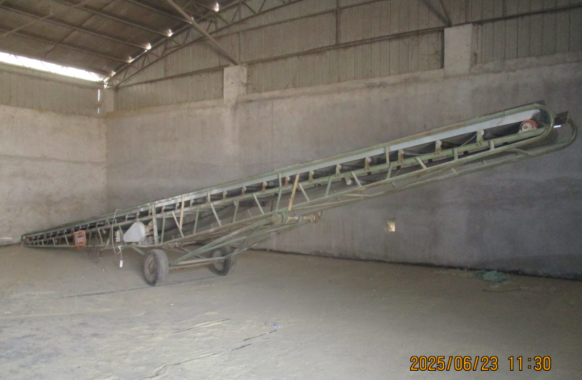 下仓东粮库东侧彩钢棚南北长60米、东西宽15米,主体框架为砖混墙体,顶棚为轻型彩钢棚顶,地面为水泥地面,彩钢棚共有2扇门分别位于西墙南北两端,该门宽4米、高3.4米、铁质材料。(见图1)