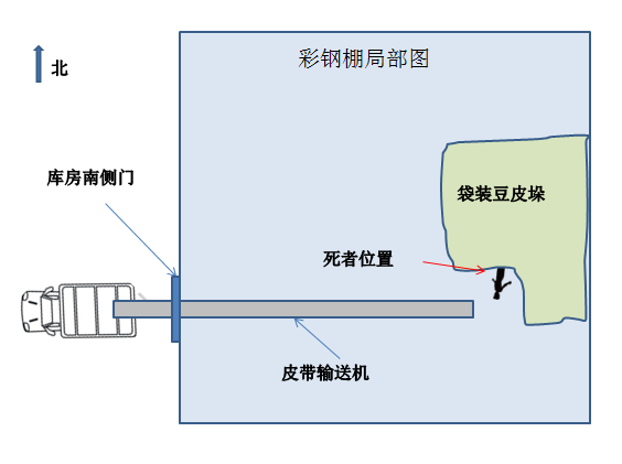 存储豆皮的彩钢棚是南北方向,出料门口在西墙南侧,当时货车头朝西、屁股对着门口,皮带输送机顶端在门口外、距车斗底面约1.5米。皮带输送机在袋装豆皮垛西南侧。权某祥位于豆皮垛和皮带输送机之间。(见图4)
